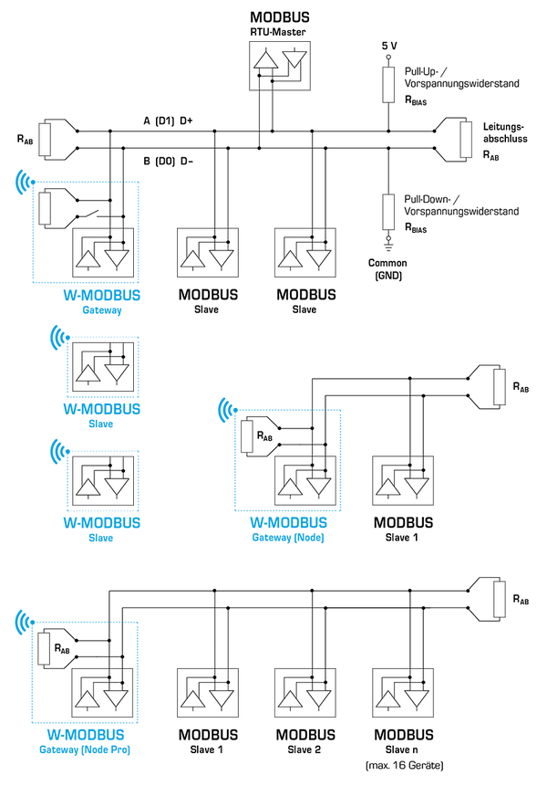 Il W-Modbus-Gateway Serve come transizione tra il Modbus cablato e quello via radio. W-Modbus. È possibile collegare anche forme miste di dispositivi Modbus cablati e via radio attraverso il W-Modbus-Il gateway può essere facilmente integrato nelle topologie di rete esistenti.