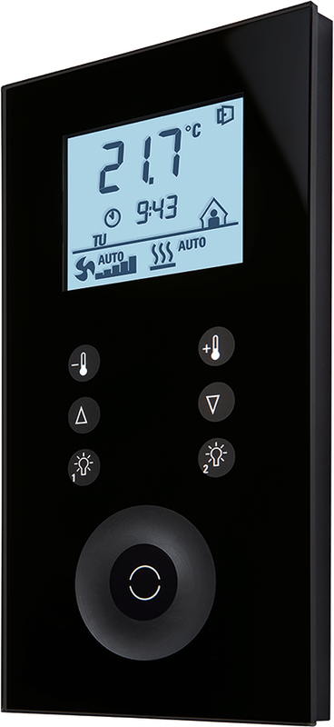 Il display multifunzionale, appositamente progettato per il funzionamento in ambiente, è dimmerabile e fornisce una chiara visualizzazione di tutti i dati disponibili in ambiente mediante simboli intuitivi. Oltre all'ora, al giorno della settimana e ai parametri climatici (temperatura, umidità, punto di rugiada, contenuto di CO2), è possibile visualizzare anche altre funzioni, come il funzionamento del riscaldamento/raffreddamento e del ventilatore, l'apertura delle finestre, l'illuminazione, l'allarme, il blocco delle chiavi o l'occupazione della stanza.