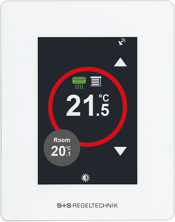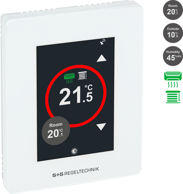 Il modello base RYMASKON® 510 Termostato con touchscreen a colori (3,5"), in un alloggiamento bianco, ha un sensore di temperatura e umidità integrato, 2 ingressi a resistenza (per sensori di temperatura NTC10K esterni), 1 ingresso digitale, 1 uscita a relè (7A) e, a scelta, con connessione Modbus o BACnet. Le unità operative per ambienti sono utilizzate per controllare il riscaldamento/raffreddamento direttamente tramite il relè (controllo a 2 punti), nonché l'illuminazione, la climatizzazione e l'ombreggiatura solare (1 zona) tramite il bus.