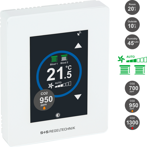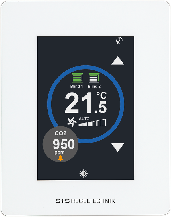 Come modello base, il RYMASKON® 610 Controllore con touchscreen a colori (3,5") in un alloggiamento bianco con sensore di temperatura e umidità integrato (sensore di CO2 opzionale), 2 ingressi analogici per sensori esterni (0...10 V), 1 ingresso digitale, 3 uscite analogiche (0...10 V) e connessione Modbus o BACnet opzionale. Le unità operative della stanza sono utilizzate per controllare la temperatura, il ventilatore e la schermatura solare (2 zone) direttamente tramite le uscite analogiche o il bus.