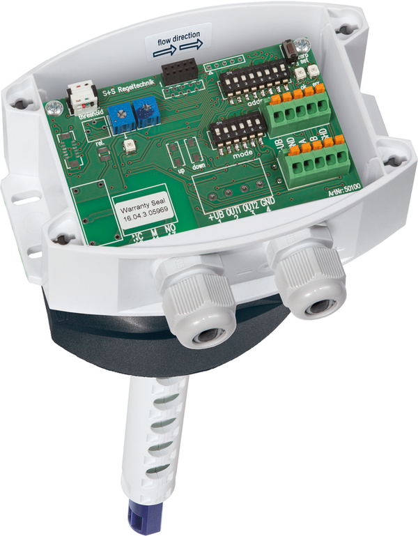 I sensori di flusso sono adatti per il monitoraggio o il controllo dei flussi d'aria nei condotti, sui ventilatori e sulle serrande, per il monitoraggio in funzione del flusso degli umidificatori e dei registri di riscaldamento elettrico in conformità alla norma DIN 57100, sezione 420, o per l'uso in combinazione con un registro di riscaldamento. 420, o per l'uso in combinazione con sistemi DDC. Innovativo sensore Modbus con interfaccia RS485 Modbus elettricamente isolata, resistenza di terminazione del bus selezionabile, interruttore DIP per l'impostazione dei parametri del bus e dell'indirizzo del bus in stato diseccitato, LED interni per la visualizzazione dello stato del telegramma, due terminali push-in separati e ampio display a tre righe (illuminato; con programmazione personalizzata a 7 segmenti e a matrice di punti). Il sensore è calibrato in fabbrica.