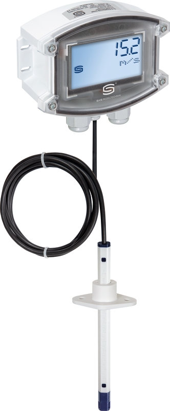 Monitoraggio elettronico del flusso d'aria a pendolo RHEASREG® PLSW con uscita di commutazione, custodia in plastica resistente agli urti con viti a bloccaggio rapido, con pressacavo, con/senza display, con sonda esterna per condotte incl. flangia di montaggio, per la determinazione della velocità di flusso (0,1...20 m/s).