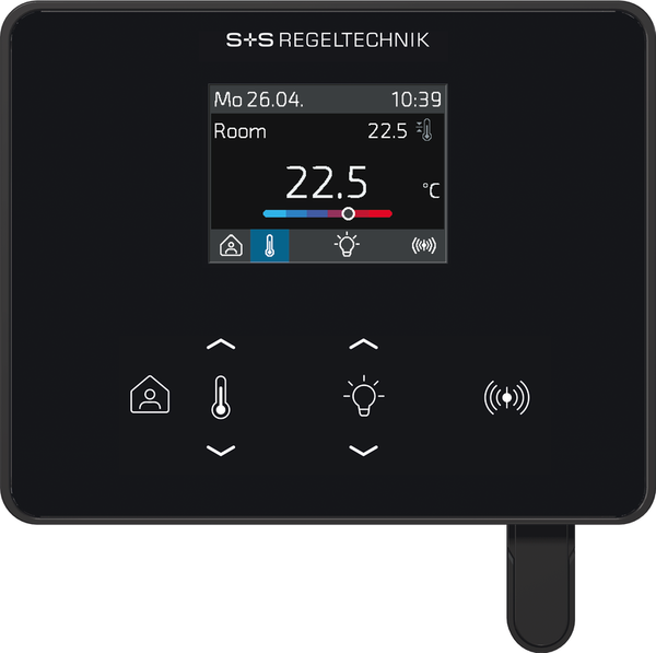 L'interfaccia di comunicazione Modbus o W-Modbus consente di modificare e monitorare in qualsiasi momento i parametri climatici del controllore tramite il BMS. Inoltre, le funzioni di protezione solare (tende esterne, veneziane) o la luce (con funzione di oscuramento) possono essere controllate tramite il bus. La visualizzazione avviene su un display TFT da 2" e il funzionamento avviene tramite pulsanti capacitivi (tasti a sfioramento).