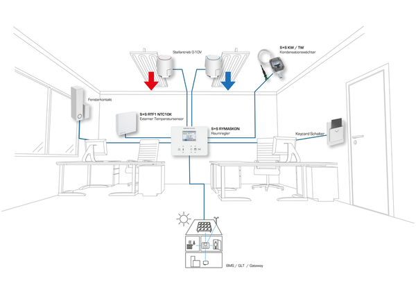 Le unità di comando per ambienti della serie RYMASKON® 1000 / 2000 / 3000 sono progettate per il controllo (fino a 5 zone climatiche) di ambienti residenziali, alberghieri e uffici e regolano individualmente i livelli di riscaldamento, raffreddamento e ventilazione degli interni. Le varianti del regolatore possono essere utilizzate come dispositivi autonomi grazie alle funzioni di controllo PI, PWM o a 2/3 punti integrate. La famiglia di prodotti si distingue per il design elegante, il funzionamento intuitivo e le numerose combinazioni possibili dei singoli componenti.