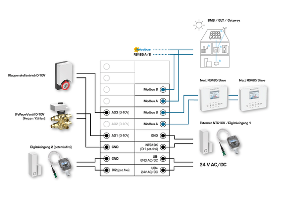 L'interfaccia di comunicazione Modbus o W-Modbus consente di modificare e monitorare in qualsiasi momento i parametri climatici del controllore tramite il BMS. Inoltre, le funzioni di protezione solare (tende esterne, veneziane) o la luce (con funzione di oscuramento) possono essere controllate tramite il bus. La visualizzazione avviene su un display TFT da 2" e il funzionamento avviene tramite pulsanti capacitivi (tasti a sfioramento).