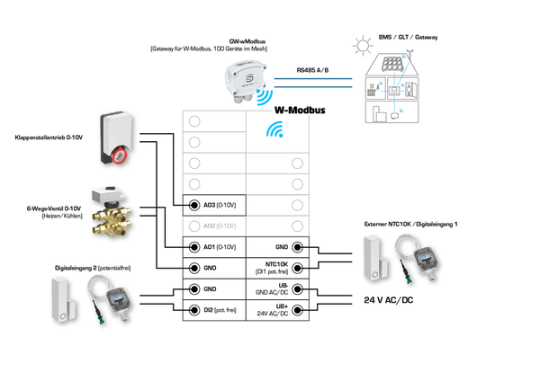 L'interfaccia di comunicazione Modbus o W-Modbus consente di modificare e monitorare in qualsiasi momento i parametri climatici del controllore tramite il BMS. Inoltre, le funzioni di protezione solare (tende esterne, veneziane) o la luce (con funzione di oscuramento) possono essere controllate tramite il bus. La visualizzazione avviene su un display TFT da 2" e il funzionamento avviene tramite pulsanti capacitivi (tasti a sfioramento).