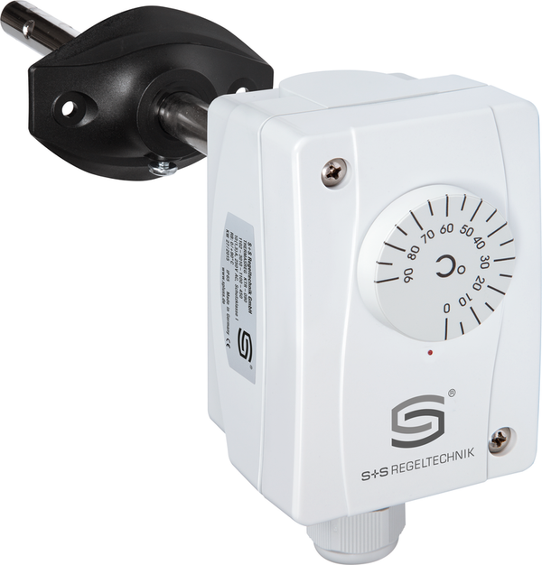 Termoregolatore meccanico/termostato a stelo TERMASREG® KTR con uscita di commutazione, utilizzato per monitorare, controllare o limitare la temperatura di fluidi liquidi o gassosi come regolatore di caldaie o nella tecnologia di riscaldamento, ventilazione e condizionamento, nonché nell'ingegneria meccanica e degli apparati e nei sistemi di generazione di calore. Il dispositivo è progettato come regolatore di temperatura regolabile a uno o due stadi. TR, monitor di temperatura TW o limitatore di temperatura di sicurezza STB.