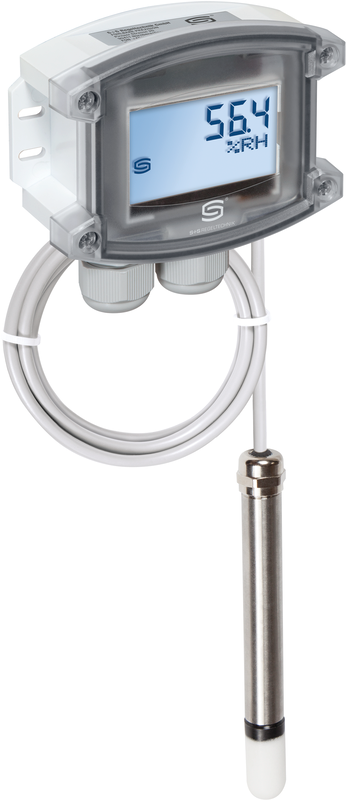 Sensore di umidità e temperatura a pendolo per ambienti calibrabile HYGRASGARD RPFTF - Modbus - T3 (± 2,0 %) o RPFTF - 20 - Modbus - T3 (± 1,8 %), con connessione Modbus, in una custodia in plastica resistente agli urti con viti a sgancio rapido, a scelta con ⁄ senza display, sensore a cavo con pendolo in acciaio inox e filtro sinterizzato in plastica (sostituibile), per la misurazione precisa dell'umidità relativa (0...100 % RH) e della temperatura (-35...+80 °C) e per la determinazione di vari parametri della tecnologia di misurazione dell'umidità. Sistema di unità di misura internazionale SI (predefinito) è impostato su Imperiale (via Modbus).