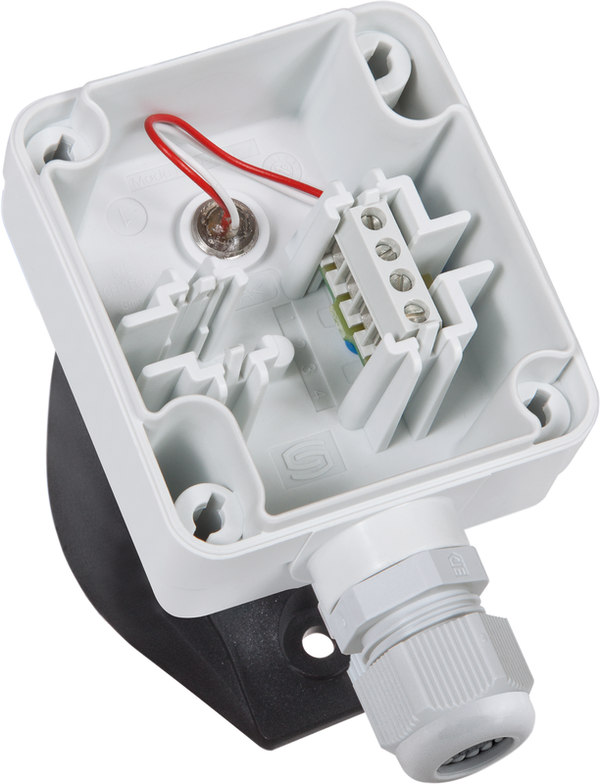 con uscita passiva, in custodia di plastica resistente agli urti con viti a bloccaggio rapido, con asta del sensore flessibile (completamente attiva), tubo di protezione in rame con rivestimento in plastica e molla antipiega, inclusa flangia di montaggio.