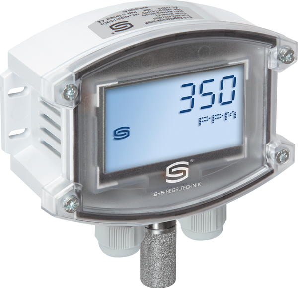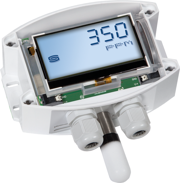 Sensore a superficie esente da manutenzione AERASGARD® AFTM - LQ- CO2 - Modbus (stadio di espansione massimo) o AFTM - CO2 - Modbus con connessione Modbus, calibrazione automatica, in custodia in plastica resistente agli urti con viti a bloccaggio rapido, filtro sinterizzato in plastica (sostituibile), a scelta con/senza display, per la determinazione del contenuto di CO2 nell'aria (0. ..5000 ppm), qualità dell'aria o qualità dell'aria (0...100 % VOC), temperatura (-35...+80 °C e umidità relativa (0...100 % RH)....5000 ppm), qualità dell'aria o qualità dell'aria (0...100 % VOC), temperatura (-35...+80 °C) e umidità relativa (0...100 % RH). Il sistema di unità internazionali SI (predefinito) può essere commutato in Imperial (via Modbus).