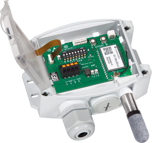 Innovativo sensore Modbus con interfaccia RS485 Modbus isolata galvanicamente, resistenza di terminazione del bus commutabile, interruttore DIP per l'impostazione dei parametri del bus e dell'indirizzo del bus in stato diseccitato, LED interni per la visualizzazione dello stato del telegramma,