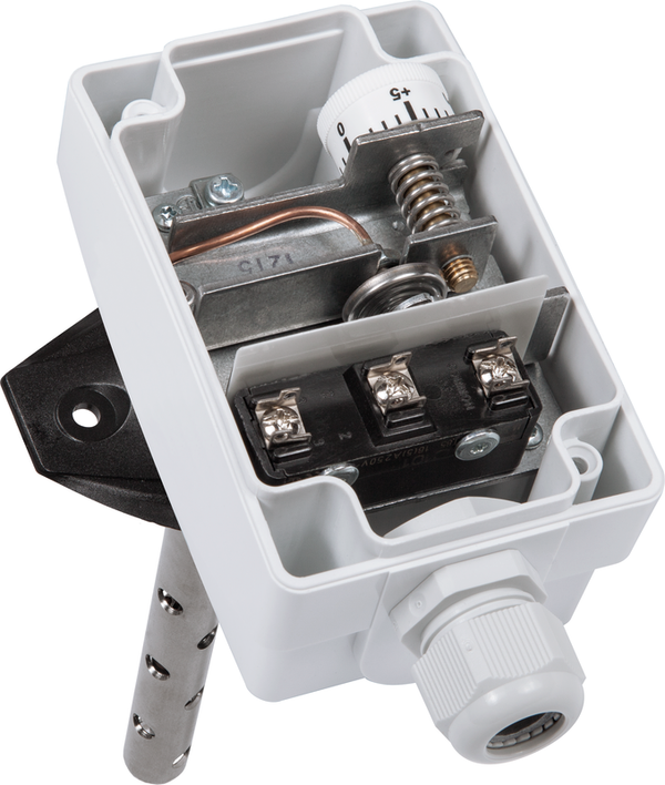 Termostato meccanico antigelo ⁄ Monitoraggio del gelo TERMASREG® FST-K con uscita di commutazione, tubo del condotto monitorato per tutta la sua lunghezza, con ripristino automatico o con interblocco meccanico, a scelta con/senza ripristino manuale.