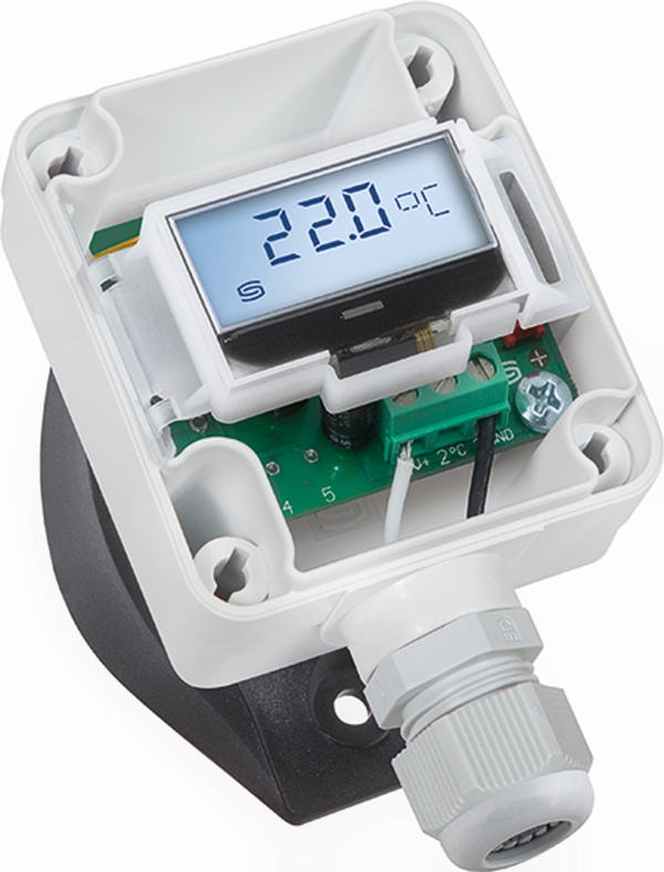 Trasmettitore di temperatura con valore medio calibrabile TERMASGARD MWTM (sensore ad asta) con otto campi di misura commutabili, uscita continua, asta del sensore flessibile e completamente attiva e tubo di protezione in rame con rivestimento in plastica (design robusto), custodia in plastica resistente agli urti, coperchio della custodia con viti a bloccaggio rapido.