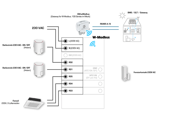 L'interfaccia di comunicazione Modbus o W-Modbus consente di modificare e monitorare in qualsiasi momento i parametri climatici del controllore tramite il BMS. Inoltre, le funzioni di protezione solare (tende esterne, veneziane) o la luce (con funzione di oscuramento) possono essere controllate tramite il bus. La visualizzazione avviene su un display TFT da 2" e il funzionamento avviene tramite pulsanti capacitivi (tasti a sfioramento).